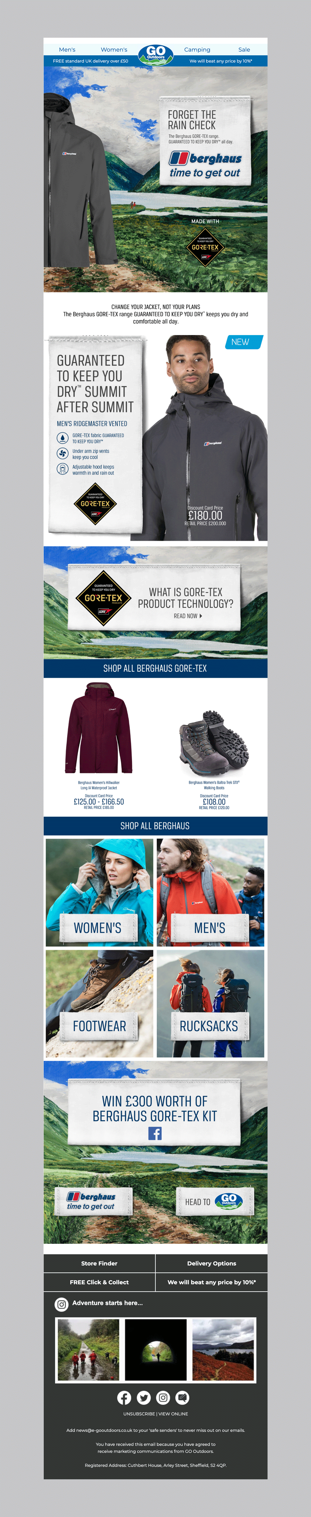 A collaboration email between Berghaus and GO Outdoors to promote their GORE-TEX range. Built with stackable images to view well on mobile, tablet and desktop screens.