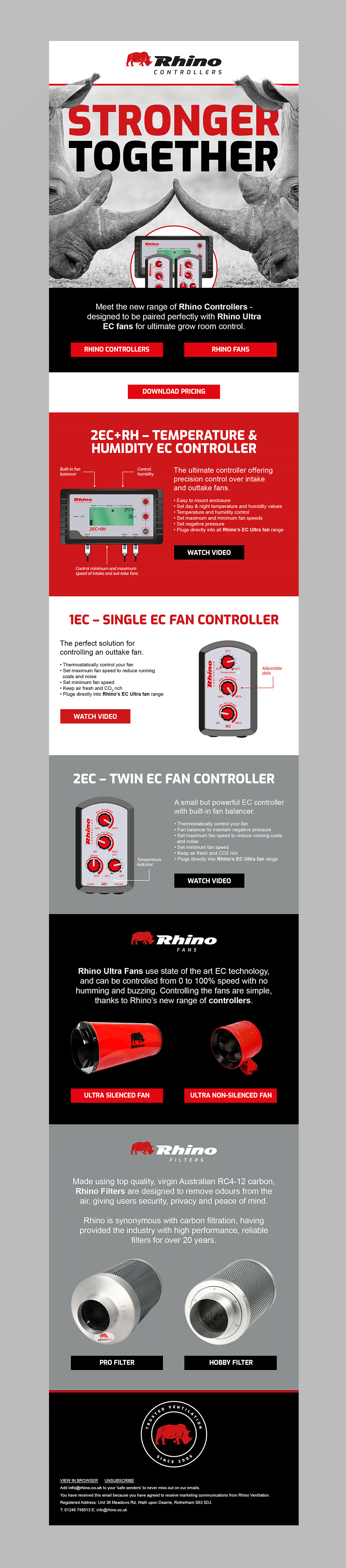 Established for almost 20 years, Rhino are one of the most trusted brands in ventilation equipment. The brand had a single logo and nothing else. The brief was to create a brand book with full guidelines for internal and external use. This included copy creation, brand statement, tone of voice, logo lockup variants, colour palette, typography and photography. A campaign concept was then required to launch a range of new controllers, which was the perfect opportunity to soft launch the roll out of the updated brand identity.