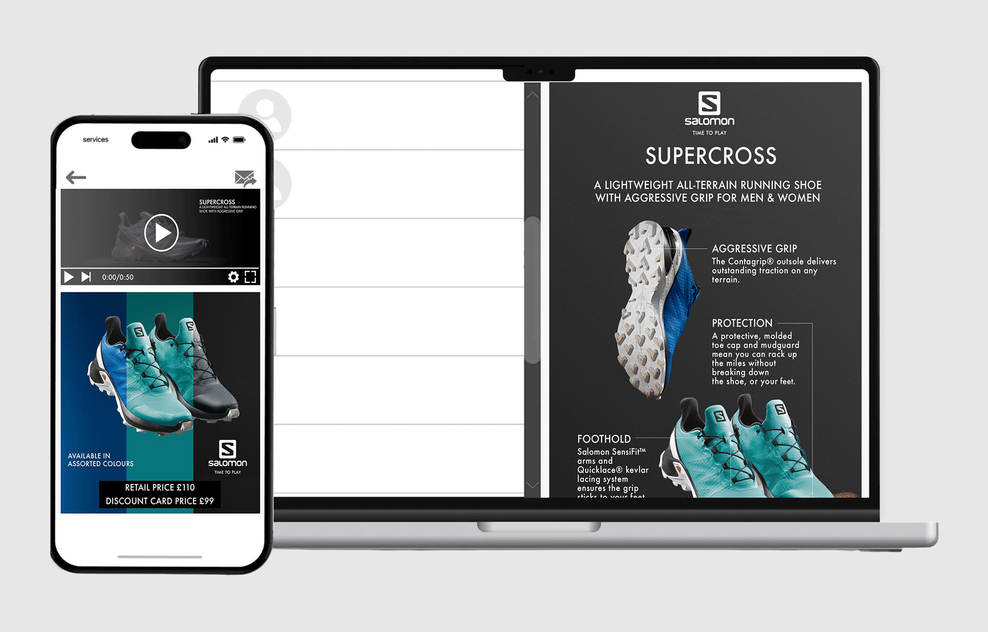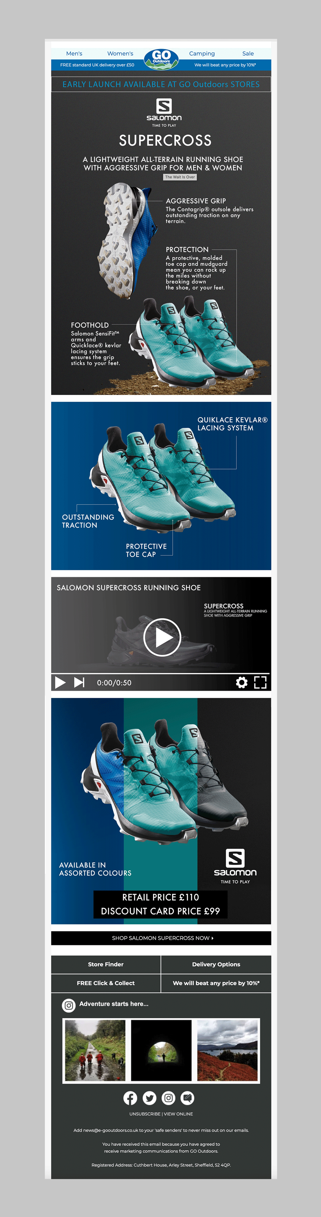A collaboration email between Salomon and GO Outdoors to promote the new Supercross all-terrain running shoe. Included a promotional embedded video. Single full width design to work on mobile, tablet and desktop screens.